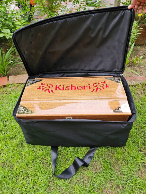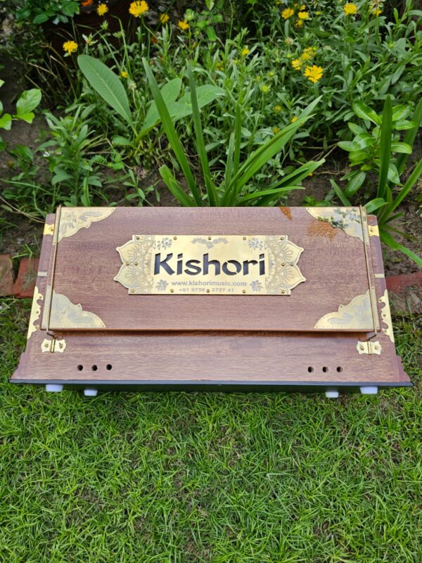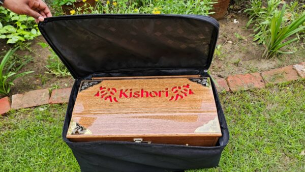 • This harmonium features a light brown finish and is crafted from Marandi wood for the body and Kail wood for the keys and reed board.