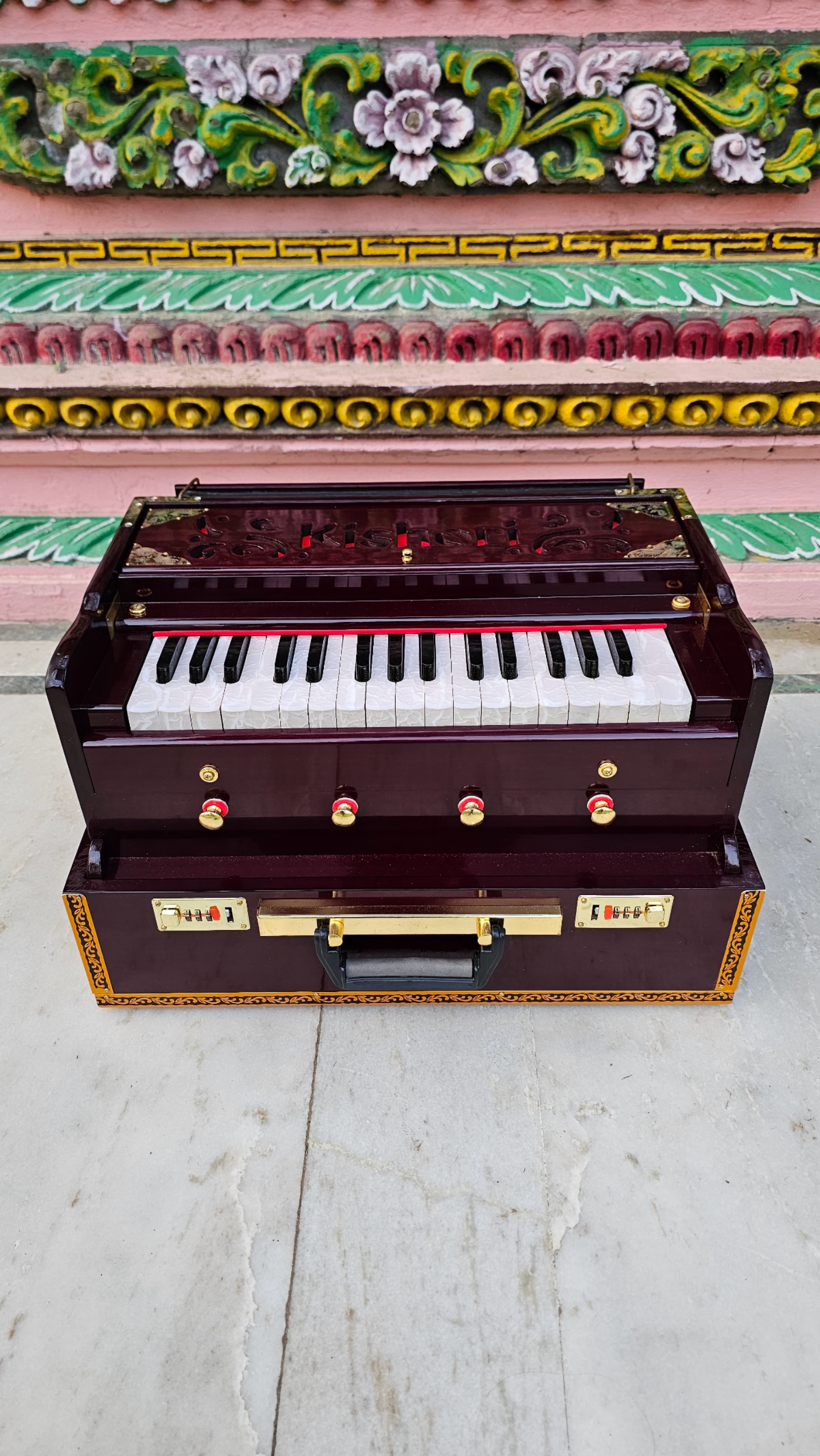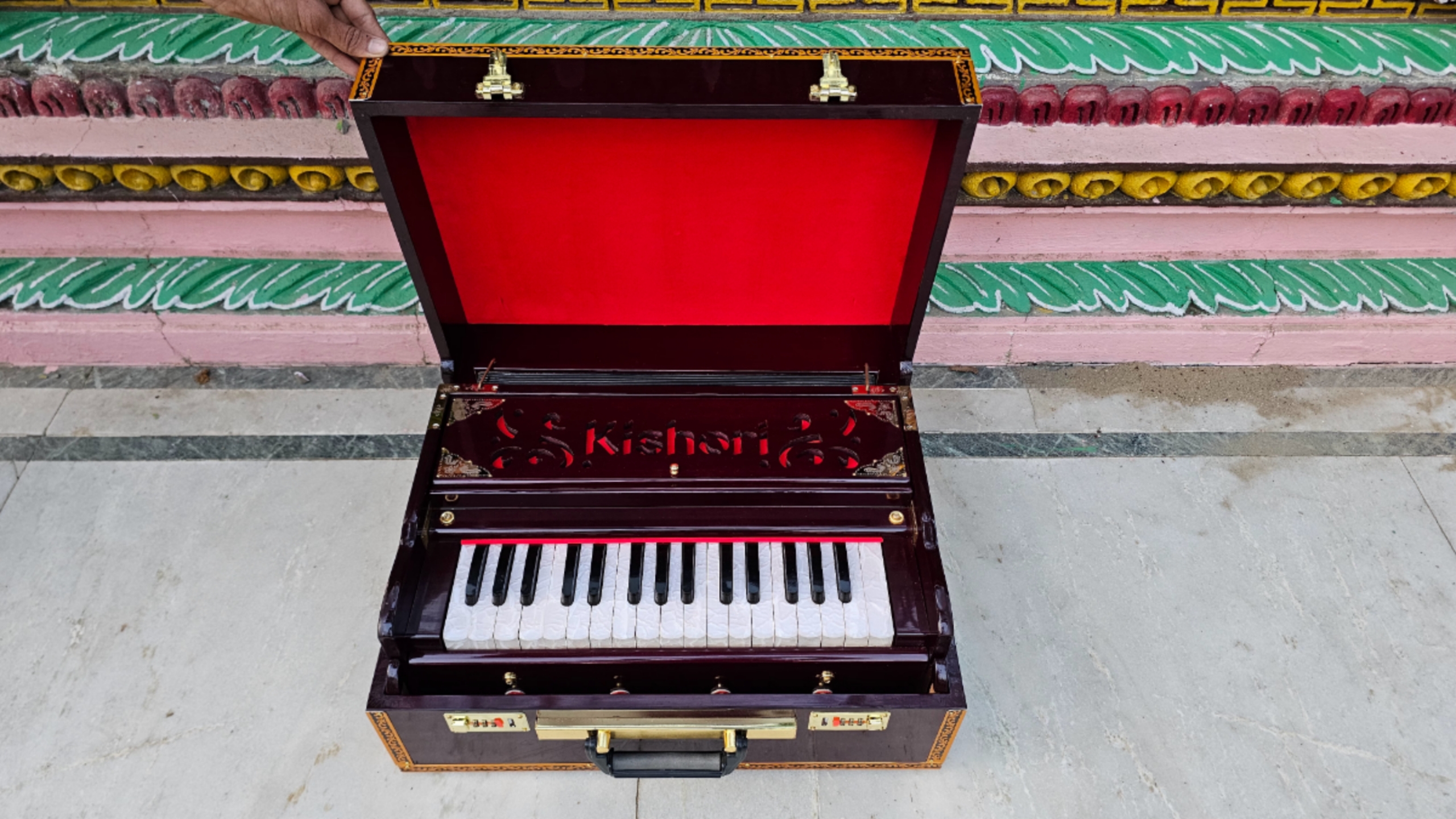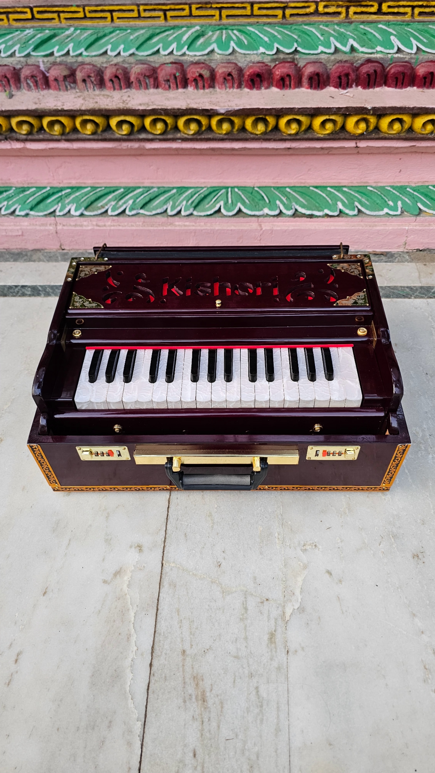 The Kishori Infinite Mahogany Color 32-Key Portable Harmonium (Product Code: 32PHM) is a top-tier instrument that combines professional-grade craftsmanship with ease of use, suitable for players of all levels. Here’s a closer look at what makes this harmonium unique:
