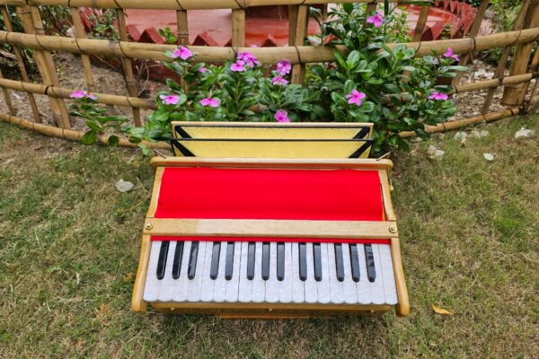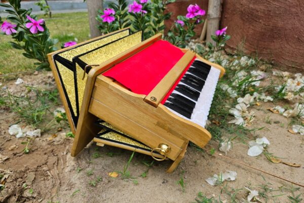• The reeds are made of brass, and there are two sets of reeds in this harmonium.